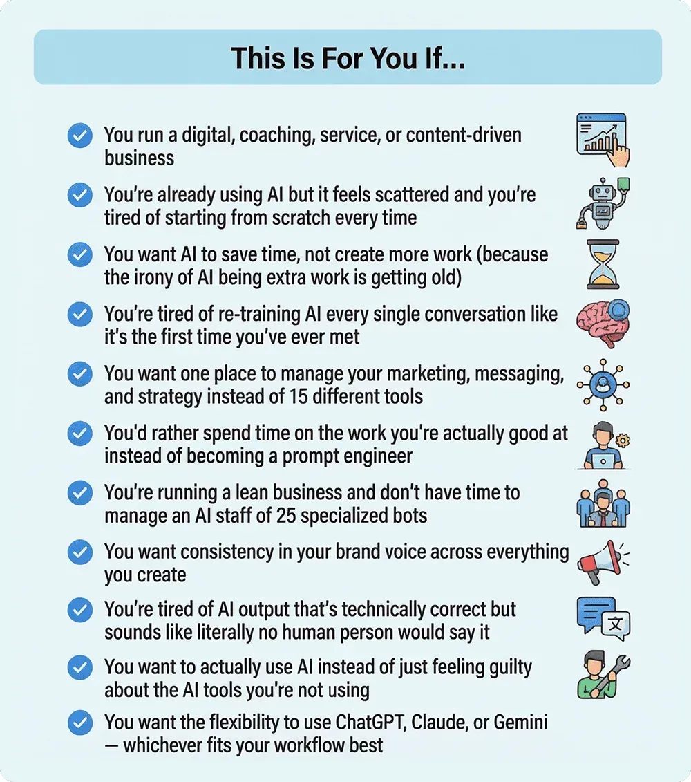 You're constantly re-explaining your offers, your audience, and your voice — like some kind of digital Groundhog Day where you wake up and AI has forgotten everything about you